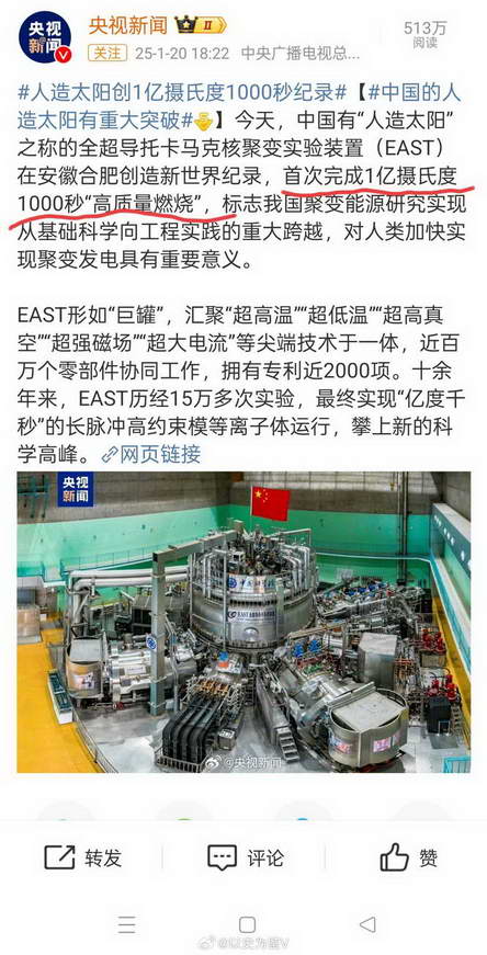 @以史为鉴 V:#人造太阳创 1 亿摄氏度 1000 秒纪录#