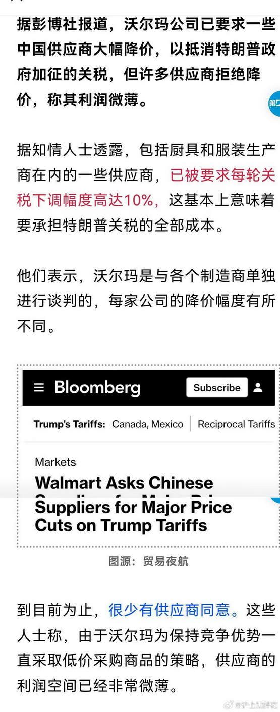 彭博社消息,沃尔玛要求中国供应商降价 10%—— 但大部分供应商本来利润都没这么多,根本不可能的,所以基本中国工厂都拒绝了沃尔玛的无理要求。