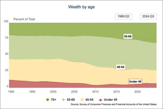 从年龄上看,美国约 30% 的财富掌握在 70 岁及以上的老人手里,只有约四分之一的财富掌握在 40 岁以下人群。