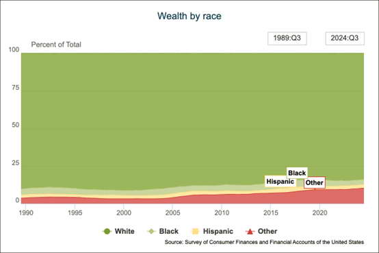 种族分布上,美国白人持有了几乎全部的美国财富,但持有比例正在缩小。