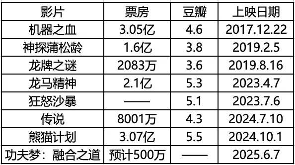 而刚刚上映的《功夫梦:融合之道》,市场上几乎没有声音,虽然打上了成龙主演的标签,但已经无法吸引任何的观众,最终将仅仅落在 500 万的水准,不断跌破市场的下限。于此,成龙电影已经来到了市场的最低点,他已经不再具备任何的市场号召力。