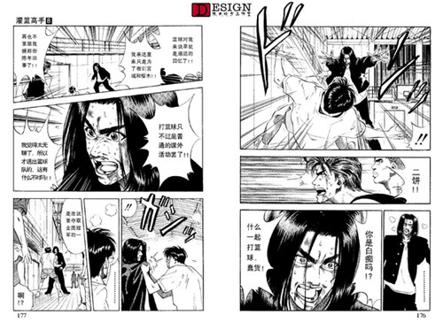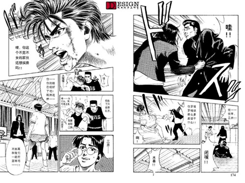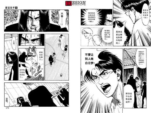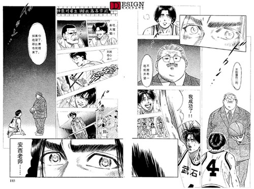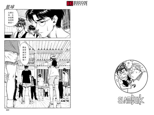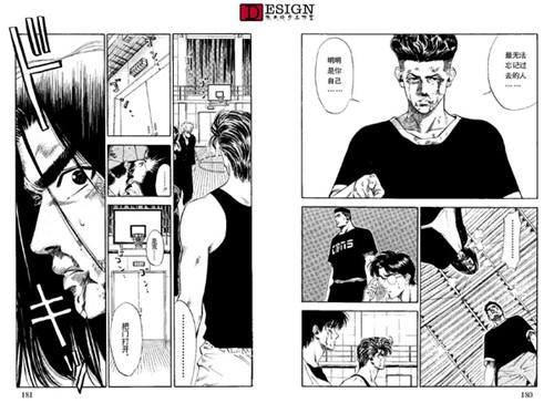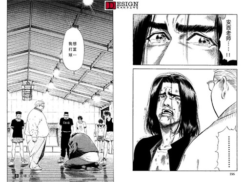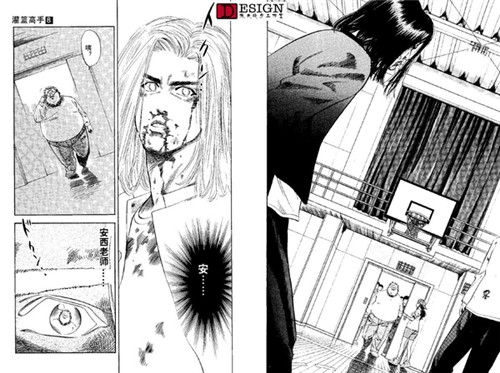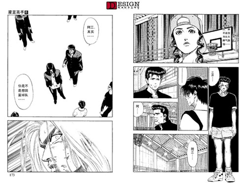 依旧是各方的反映,这里给了一个情节点,就是德男去劝三井了。先不看三井的反映,我们看到德男这个配角也很有意思,看得出他对三井的感情真的很深,这种情况下第一个看出了三井的心理,而且没头没脑地当众说出来。(也不考虑三井的面子 Orz)我们再看一下这一页最后一幅三井转头杀的镜头,这动态感真实没的说,后面的运动模糊线,还有整体失色的画法,以及画面重点放在了三井的眼睛上。他的眼睛是本话在画面上的绝对中心。