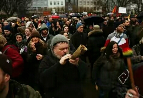 现在冰岛的男人不出门做强盗了,可好些古时候的风气还在。前两天不是游行示威吗?一不高兴,那维京海盗味又出来了。连下图里那个牧师,都没点超凡脱俗的模样,还吹起战斗号角来了。