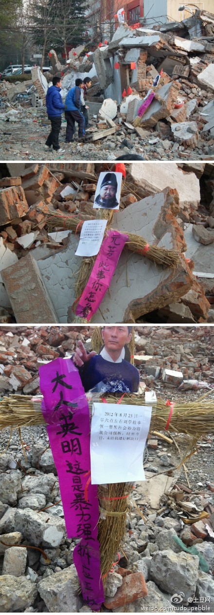 12月9日在济宁市市中区阜桥办事处刘庄村红星东路一处拆迁的废墟上看到,贴着狄仁杰、李元芳头像的稻草人引人注目,狄仁杰头像的稻草人写着经典语录:“元芳此事你怎么看?”李元芳头像的稻草人则写着:“大人英明,这是暴力强拆,应严办。”这是怎么了?难道由于冤情?请来狄大人来断案?(12月12日中新网)