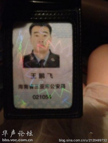 ★三亚市公安局2012年12月18日下午通报称,经调查核实,证实微博中照片显示的警官证系三亚市公安局民警王鹏飞所持有,王本人承认确与该女子相识。目前,王鹏飞已被停止执行职务,接受组织调查。