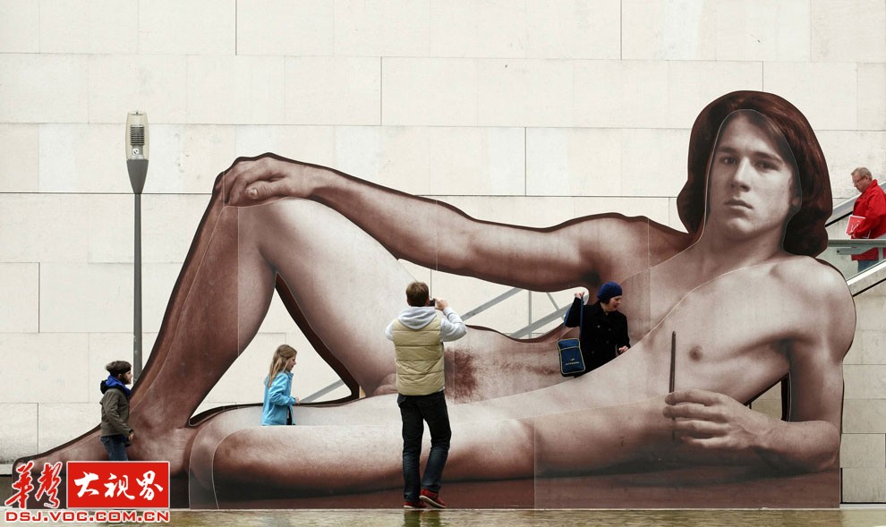 在维也纳利奥波德博物馆,路人在一个展览的艺术设施前拍照。