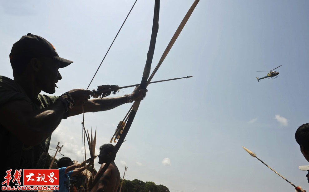 反对贝卢蒙蒂水电站大坝的抗议中,当一架直升机在上空飞过时,亚马逊印度安人、渔民和当地居民做出的反应。