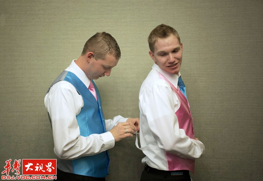 纽约,结婚登记前,Massey为他的另一半Frost整理背心。
