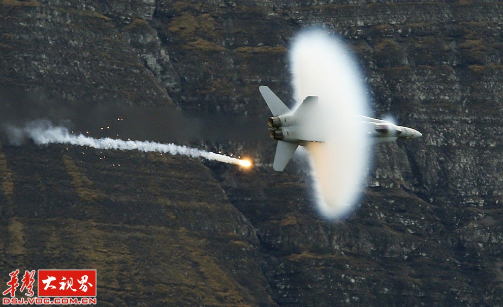 瑞士空军飞行表演中的F18喷射式战斗机。