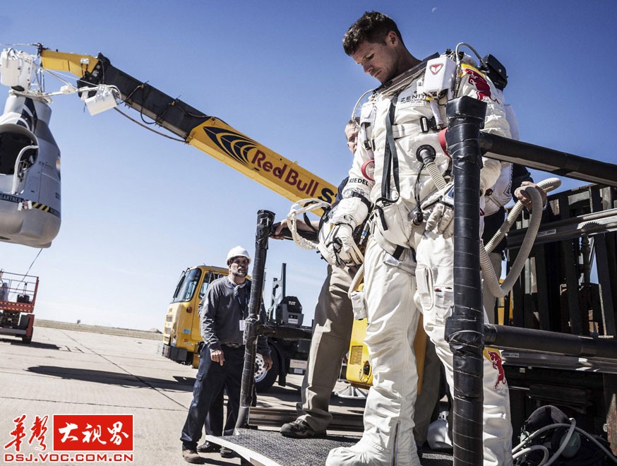 奥地利飞行员鲍姆加特离开他的胶囊舱。由于强风肆掠罗斯威尔,他的任务被中止。