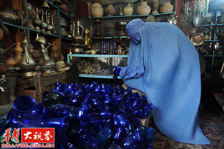 一名阿富汗妇女在一家商店内挑选售卖的花瓶。