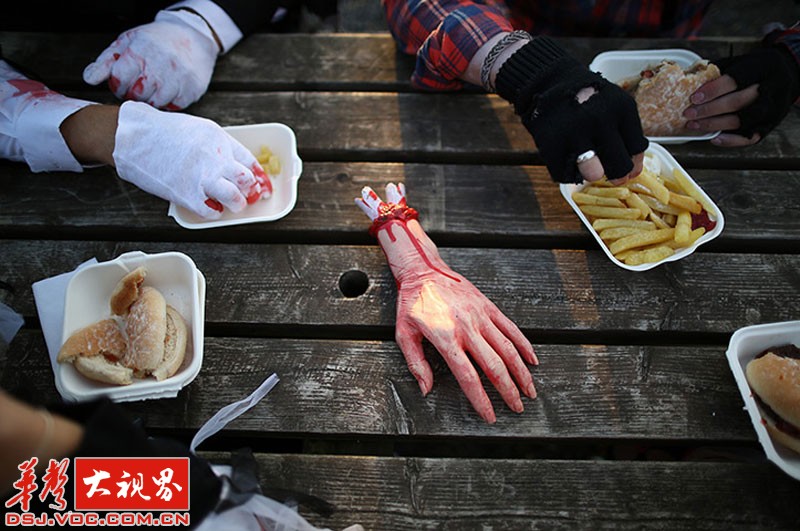 西萨赛克斯的僵尸节,游客打扮成僵尸吃午餐。
