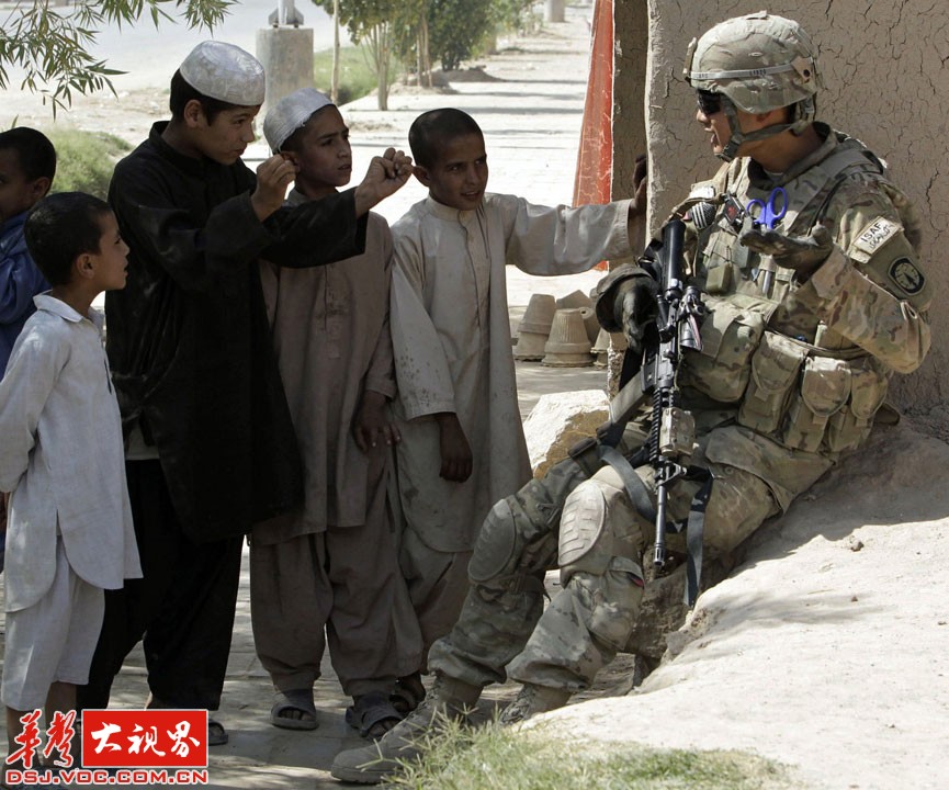 在阿富汗城市坎大哈巡逻时,美军士兵TerryLazaro和孩子们聊天。