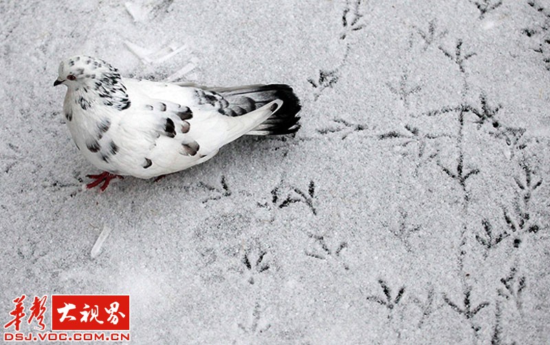 俄罗斯的克拉斯诺亚尔斯克,鸽子在雪地上留下一组脚印。