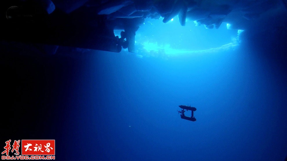 这张照片显示的是南极洲东部,海冰下自由游动的机器潜水艇。