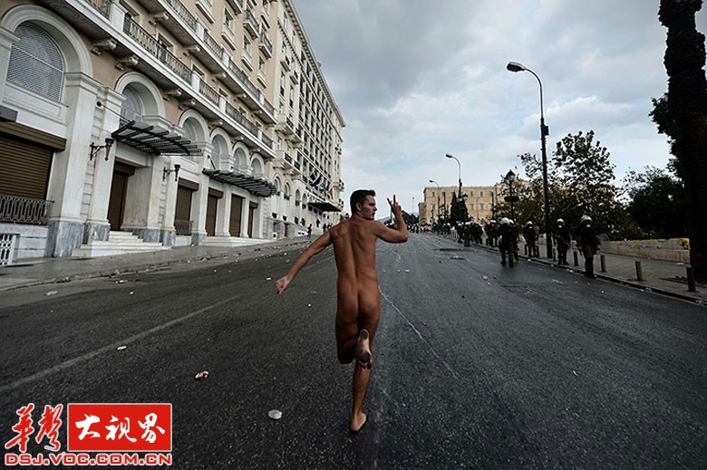 雅典,一名裸体示威者在一场反对德国总理默克尔到访的示威活动中举着胜利的手势。