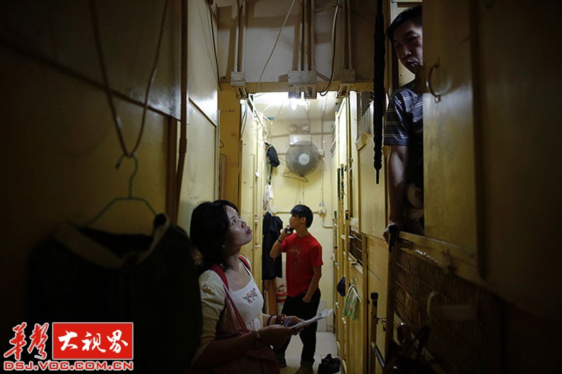 香港,一名非政府组织工作人员在跟住在木箱屋的人交谈。24人居住在这种由一间不足50平米单身公寓隔成的“棺材房”里。