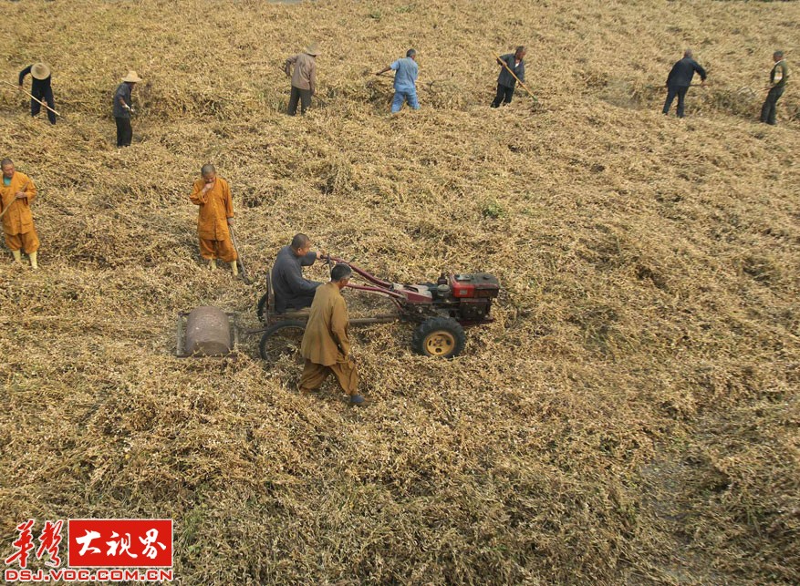 洛阳白马寺的僧侣们在收割黄豆。