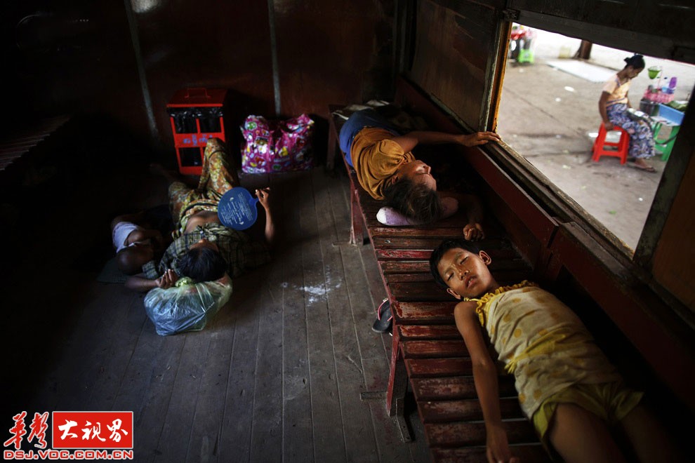 仰光中央车站,人们睡在一列停止的火车上。