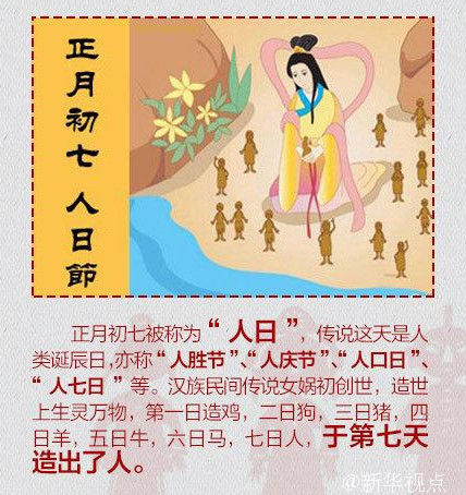 真的,初七是我们每个人的生日。传说由初一起,上天创造万物的次序为“一鸡二狗、三猪四羊、五牛六马、七人八谷”,初七是“人日”,即人的生日。这个节日距今已有2000多年历史。