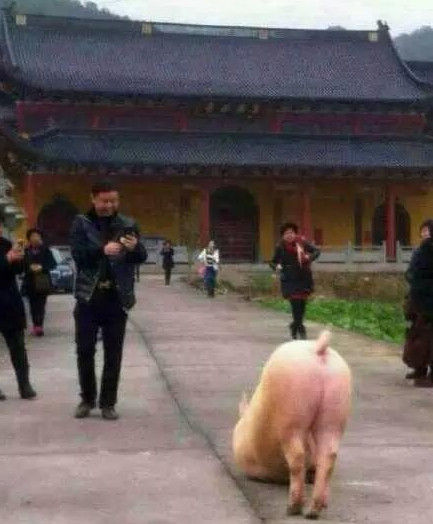 春节期间,浙江温州永嘉县的一头猪跑到寺院门口下跪,人们纷纷用手机拍照录像,猪却一动不动地跪着。居士们只好去寺院请师父,师父出来为它作三皈依、开示以及念《心经》后,这头猪才转身走了。