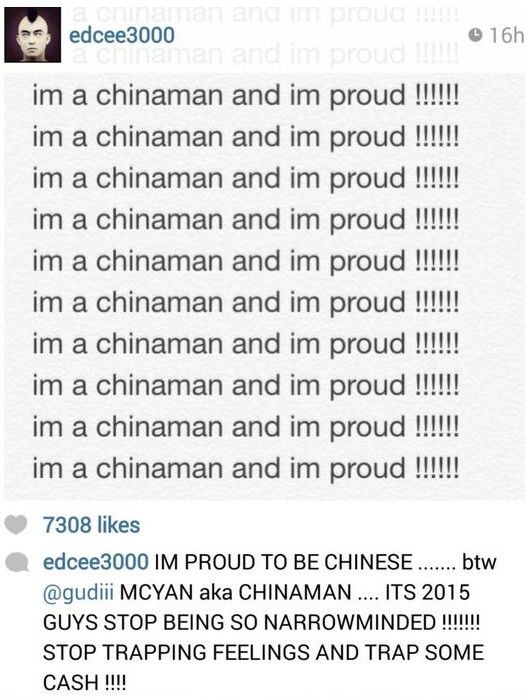 2月24日,亚洲知名度最高的摄影师陈冠希在社交网站上发了一张重覆写了多句 “I AM A CHINAMAN AND I AM PROUD!!(骄傲身为中国人)的照片,随后又留言:我以身为中国人为傲…2015年大家不要再当个思想狭隘的人!别受自己感觉困扰,然后赚多点钱!