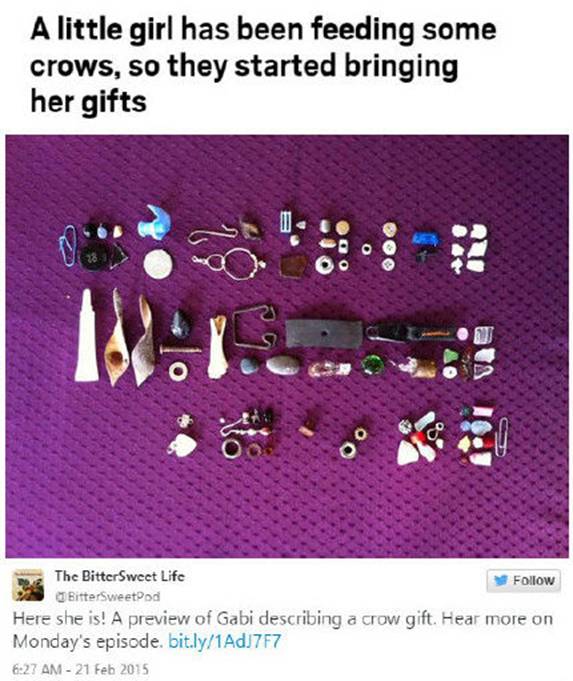 Gabi是个8岁的小姑凉,她经常在院子里喂乌鸦,没想到乌鸦知恩图报,没事就给她留下一些blingbling闪闪的东西当报酬,玻璃珠,纽扣,螺丝,钥匙扣多达几十种,有点萌哦。