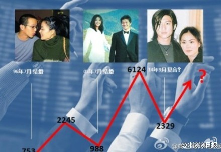 王菲和窦唯96年7月结婚,A股从753最高涨到2245;王菲和李亚鹏2005年7月结婚,A股从988最高涨到6124。现在王菲和谢霆锋又要领证了…