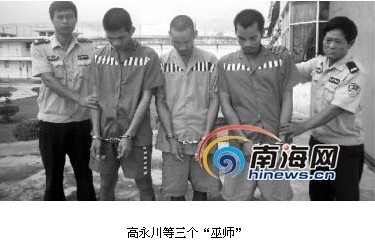南国都市报8月22日报道 日前,乐东发生一起恶性命案,一名自称是“玉皇大帝”派到人间的“巫师”伙同他的两个徒弟为一位村妇治病,称村妇身上有鬼,竟给村妇灌十几斤白酒,让村妇吐“鬼”。在村妇酒精中毒不省人事时,“巫师”认为村妇这个“鬼”不肯认错,如果活着就会害村妇家里的人,结果“巫师”伙同死者的3个儿子将酒精中毒的村妇拉到墓地活活烧死了。因涉嫌故意杀人,乐东检察院对犯罪嫌疑人高永川等6人批捕。
