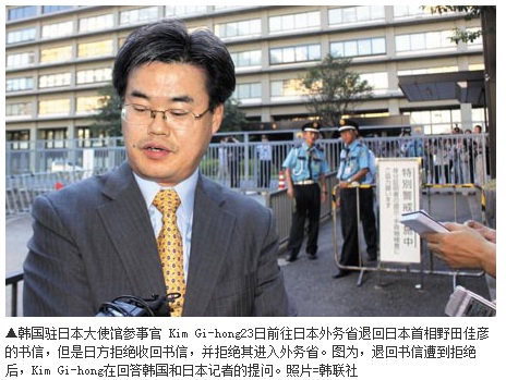 据韩联社23日报道,韩国驻日本大使馆计划当天下午将野田首相17日致韩国总统李明博的亲笔信退还给日本政府,但日本外务省拒绝面见前来退信的韩国大使馆参赞金基洪(音)。据报道,日本外务省甚至连金基洪的车辆也未允许进入,金基洪只好在大门外等了一个多小时后返回。韩国《朝鲜日报》网站称,韩国政府决定通过邮寄方式退信,已经用挂号信将野田亲笔信寄了出去,估计24日上午就能送达日本外务省。韩联社评论称,韩国政府退回其他国家领导人发来的信函实属罕见。