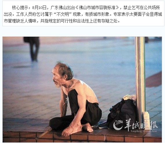 “广场、车站、港口、码头、人行天桥、体育场馆、剧场、公园、旅游景点等公共场所无人员乞讨、露宿。”,8月10日,佛山市首次出台《佛山市城市容貌标准》,佛山市住房和城乡建设局是《标准》的起草单位,该局执法科工作人员称,乞讨属于“不文明”现象,有损城市形象。(西部网8月28日)
