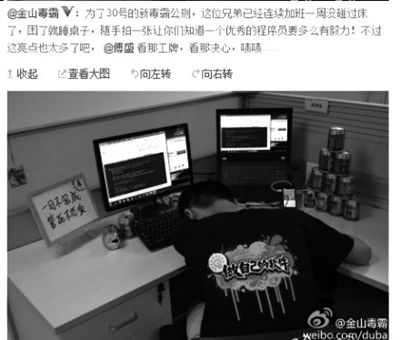 “美好生命换来的产品,让我们怎么接受使用?”金山员工公司内死亡的消息一经发布,引发网友热议。更有人贴出了一张微博截图,质疑金山软件旗下的金山毒霸鼓励员工加班。