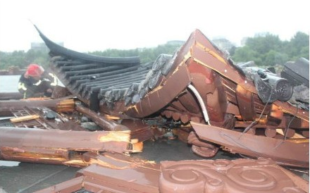 ◆古建专家称,仿古建筑被吹倒,问题最大可能出在施工环节。
