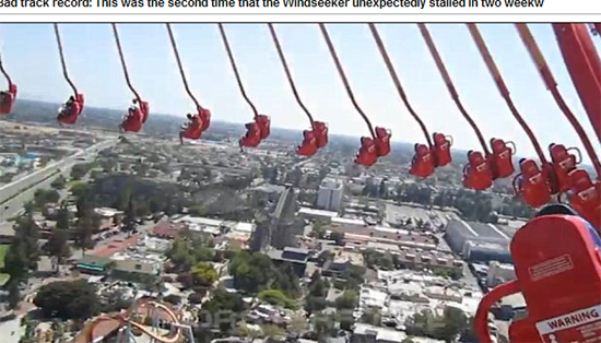 报道称,美国南加州纳氏草莓乐园中的游乐项目“高空旋转飞椅”日前发生故障,20名游客正在享受被荡到300英尺(91.44米)高空的快感,然后庞大的机器突然停了。游客身子还斜着,双腿在空中荡着,他们就已这个姿势保持了近4个小时,直到机器重新开始运转。