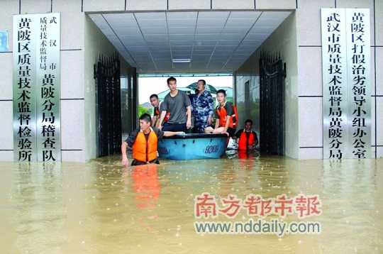 记者对比发现,两幅图中除了救援的工具不同,第二幅当中乘船者的衣着、伞具也与第一幅不同,而流传在网上的原始图片说明,也仅简单交代为“7月13日,武汉遭遇特大暴雨袭击,几名男子乘船解困”,未透露图片中的场景是否摄自武汉质监局。