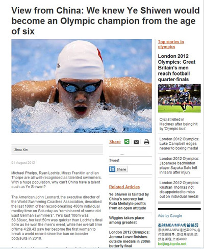 这位中国记者在信中质疑西方媒体中国认可菲尔普斯、罗切特、富兰克林和伊恩-索普是世界级的天才选手,而中国作为一个人口大国,为什么不能拥有像叶诗文一样的天才。他表示,从叶诗文还是一个六岁的孩子时,她在游泳方面就表现出超乎常人的天赋。叶诗文的第一个教练魏巍正是因为叶诗文的手和脚都比较大而注意到她。叶诗文对2002年魏巍教练建议她学习游泳的场景还记忆犹新。她说,“当时魏巍教练对我说你毫无疑问会成为一个世界级冠军,一个奥运冠军。”叶诗文理解能力非常好,在学习游泳的第一年,她就已经学会了全部的四个泳姿。在2008年10月,她和来自全国各地的100多名孩子加入了国家青少年特训营,进行了为期2个月的训练。