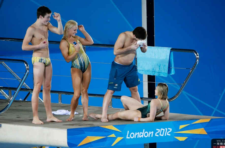 当地时间7月23日,澳大利亚跳水运动员在训练期间拍照留念。REUTERS/David Gray