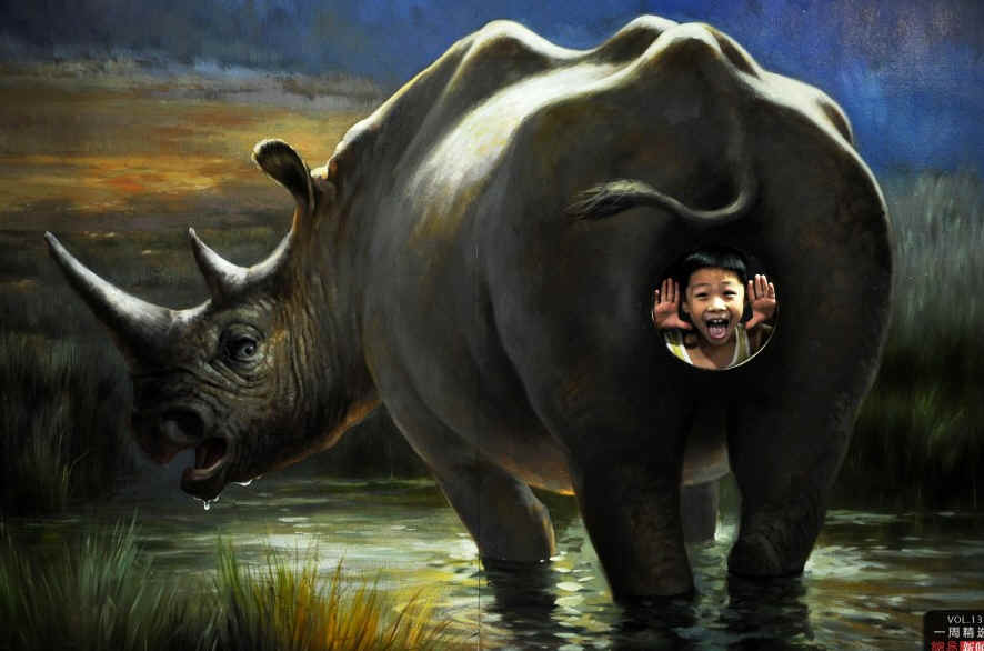 7月21日,杭州和平会展中心举行的“3D艺术”展览中,一名女孩躲到“犀牛”的肚子里。Peter PARKS/AFP