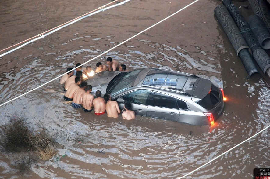 7月23日,重庆朝天门,一辆轿车被洪水围困,市民准备合力将被困车辆抬出,所幸当时车内无人,没有造成人员伤亡。东方IC