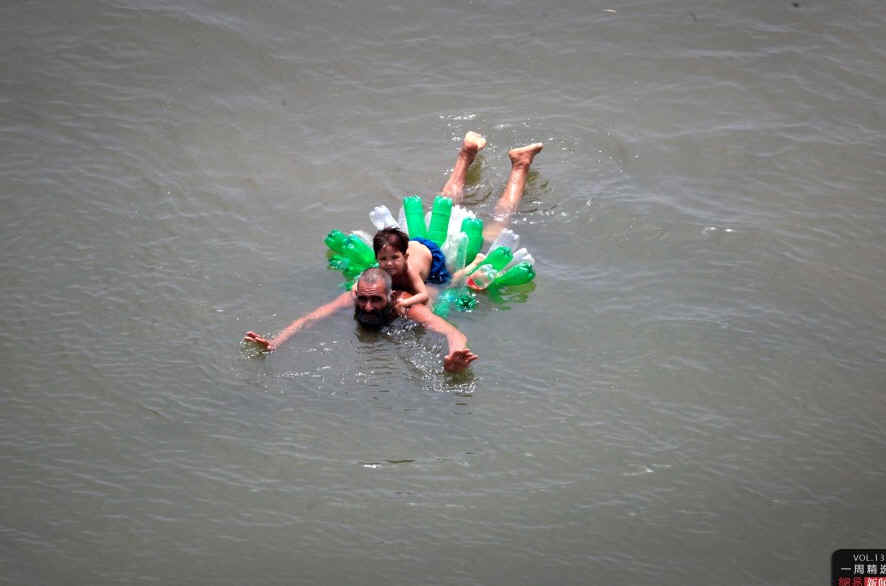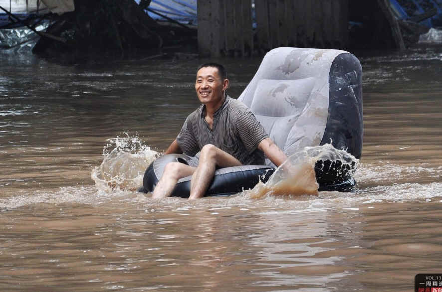 7月25日,洪峰逐渐退去,在长滨公园路段,漂浮在水中的沙发被一位市民当成皮划艇。7月24日,长江今年最大洪峰,186.7米洪峰抵达重庆,重庆城区许多街道被淹没。renjun/东方IC