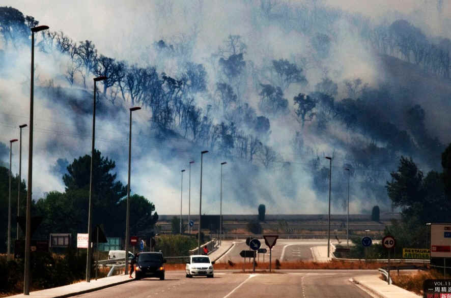 当地时间7月22日,西班牙与法国边境地区加泰罗尼亚省发生山火,临近高速公路的山坡上大火弥漫。据当地政府消息,大火导致3人死亡,约100人受伤,数以千计居民被迫留在室内。Josep Ribas/AP