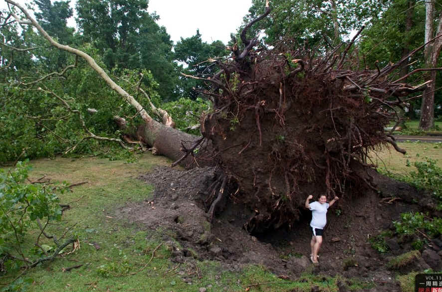当地时间7月26日,美国纽约州东部城市埃尔迈拉,一名女子在被吹倒的大树前留影。前一日,当地遭龙卷风袭击,暴雨和大风造成当地大面积停电,上百航班延误或取消。REUTERS/Adam Fenster