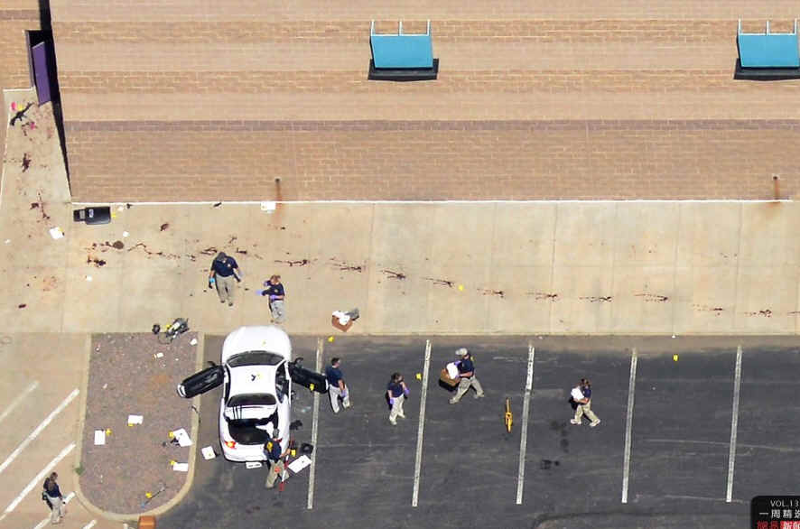 当地时间7月20日,美国科罗拉多州奥罗拉市,警察在丹佛电影院停车场检查枪击案嫌疑犯詹姆斯·霍尔姆斯的车辆,画面左上角是一把枪。当日凌晨,电影《蝙蝠侠前传3:黑暗骑士崛起》在此首映时,詹姆斯·霍尔姆斯在影院屏幕前向观众射击,造成12人死亡,58人受伤。REUTERS/John Wark
