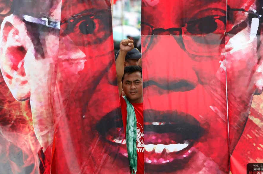 当地时间7月23日,菲律宾奎松城城郊,一名抗议者举起他的拳头,抗议现任总统阿基诺三世的国情咨文。当日,阿基诺三世发表国情咨文,谈及南海问题时,要求中国不要侵犯菲律宾领土,尊重菲律宾主权。阿基诺宣称,菲律宾对帕纳塔格礁(即黄岩岛)拥有“主权”。Bullit Marquez/AP