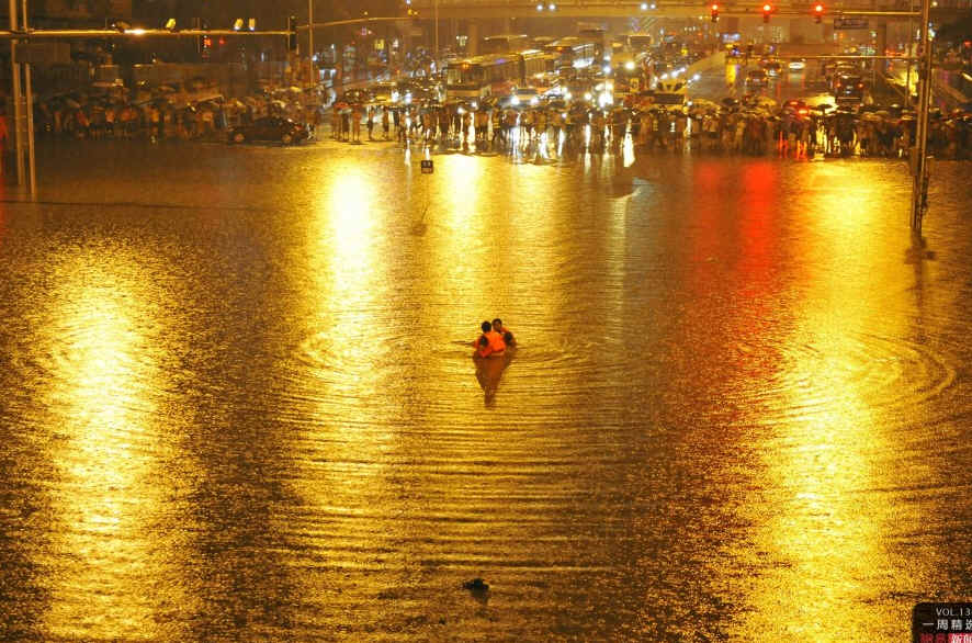 7月21日晚,两名救援人员在北京东城区广渠门桥下试图寻找被困人员。当日,北京遭暴雨袭击,气象部门发布橙色暴雨预警,平均降水量达到170mm,最大降雨点房山区河北镇达460mm。广渠门桥下短时积水4米深,丁志健在此遇难。陈杰/CFP