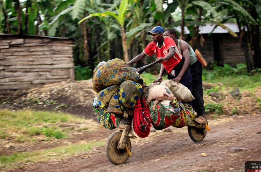 当地时间7月24日,刚果(金)东部城市戈马,难民用木质自行车装载其财产逃难。近日,刚果叛军与政府军在东部地区发生交火,迫使当地数千居民逃离生活的家园。REUTERS/James Akena