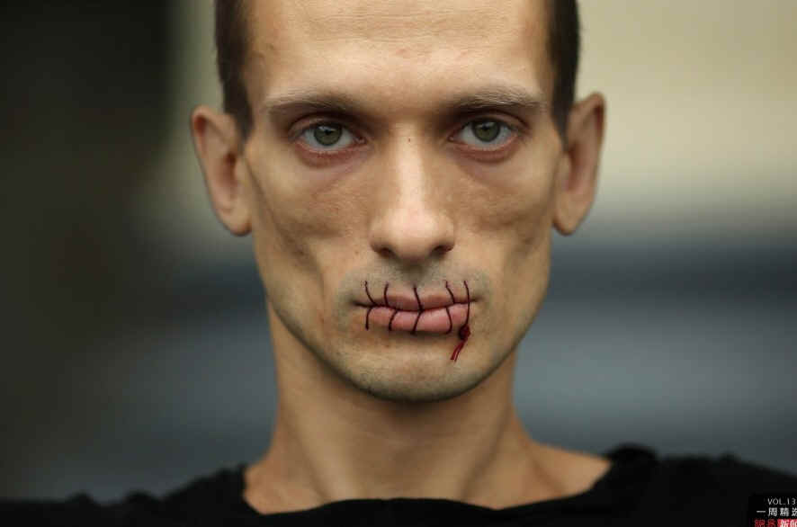 当地时间7月24日,圣彼得堡,一名艺术家用封住嘴巴的方式抗议,要求释放Pussy Riot乐队成员。据悉,今年3月,Pussy Riot乐队成员因在莫斯科救世主大教堂演唱侮辱普京的歌曲而被捕,该乐队的三名成员被控告扰乱公共秩序,日前,三人仍在监狱当中,他们将面临最高七年的监禁。REUTERS/Trend Photo Agency