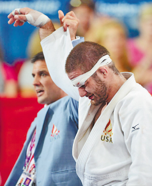 男子81公斤级柔道半决赛上,美国人史蒂文斯在与卫冕冠军德国选手比朔夫的交战中受伤,眉骨、眼角和嘴里都有鲜血流出。他用绷带对伤口进行简易处理,再次顽强地重回赛场坚持比赛,面对强大的对手,史蒂文斯咬牙坚持到底,没有丝毫的退缩。 虽然最终不敌对手无缘决赛,但是血战到底的史蒂文斯赢得了全场观众的敬意,离场时大家都站立鼓掌。