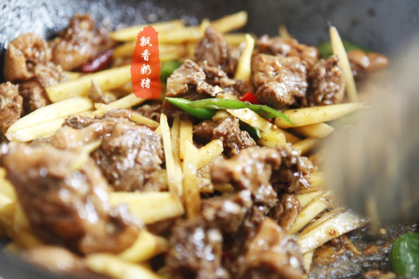 3 约20分钟左右,开盖,锅内水已经基本收得差不多了,鸭肉也已经基本做熟(这时候,可以拿筷子夹一小块尝尝)。放入适量嫩姜、指天椒丝、郫县豆瓣进行大火爆炒。