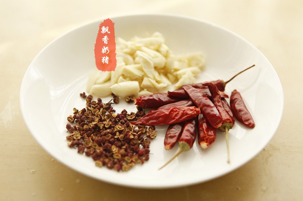 这是我做姜爆鸭常用到的一些调料:大蒜、花椒、干辣椒。其实再加八角、桂皮等都是可以的。我今天加了1颗八角(但是忘记拍照啦!)